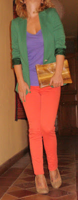 Me encanta la combinación de naranja + verde + morado. Pero caí en la cuenta, inocentemente, de que un gucci jamás podría entrar en mi armario, ni rebajado. Así que, ni corta ni perezosa uní los tres tonos y pensé: tendré narices a ponermelo????. Pues si, tuve. Cuando llegué a la oficina pregunté: se me ve???? nos reimos un montón.